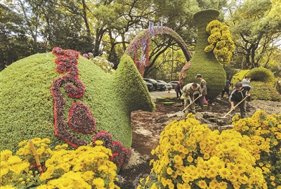 2022年杭州金秋菊花展将于11月5日在植物园举行。在主要展区玉泉,菊花遍地,各种以“宋韵”为主题的菊花造型精美典雅,长廊中各地的珍贵精品名菊争奇斗艳,此次菊展于月底结束。目前菊展仍正在加班加点地紧张布展中。夏之明 摄