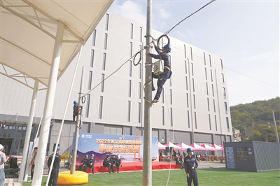 脚踩脚扣,身体在宽带电线杆上腾挪,手中光缆上下翻飞……当天上午9时许,参赛者们“全副武装”,展开实操环节竞赛。选手们需要按照规定完成“高空布线”“穿管入户”“熔接调试”等3个模块。