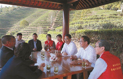 | 昨日下午,吕志良(右三)深入景宁马岭头茶山基地宣讲党的二十大精神。 记者邹伟锋 摄 |