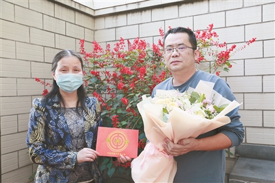 | 鄞州区总工会副主席戴惠芬(左)为蔡默思(右)送上鲜花、慰问金。 |