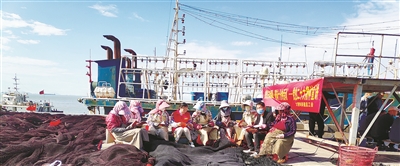 图为玉环市总工会的宣讲团成员在大麦屿码头为补网的“渔家女”宣讲党的二十大精神。