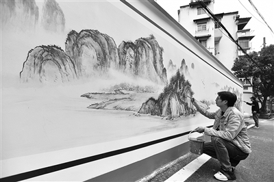 近日,在建德市新安江街道府西社区水碓巷小区,几名画师正在将反映新安江畔自然山水生态的美景,通过水墨写意艺术手法融入到一幅幅作品中,描绘在一面面墙体上。