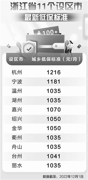 日前,从省民政厅获悉,12月1日起,浙江在全国率先实现低保标准市域同标,11个设区市低保标准首次全部突破1000元/月。