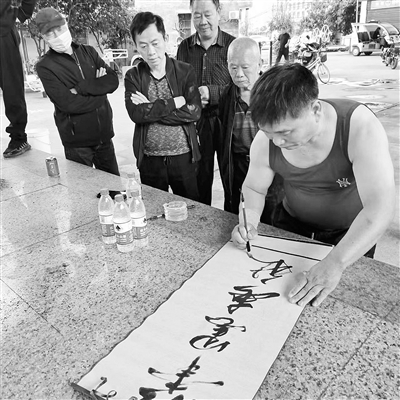 冯忠义告诉笔者,书法和铁掌一样都是刚柔并济,两者相辅相成。以掌劈石时,肩要放松柔软,气血直达指端,才能使掌刀丰厚富有弹力;写书法时,同样需要提气,手腕柔软收笔干脆有力。所以练习铁掌功夫后,他的书法水平跟着水涨船高。