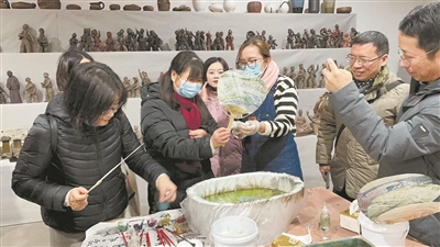 | 作家会员们在丁海龙非遗传承馆体验漂漆扇项目。通讯员汪沈钰、王英姿 摄 |