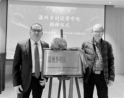 本报讯 通讯员张晓韵、汪梓慧报道 为加快乡村运营人才培养,助推共同富裕,12月4日,省内首个“乡村运营学院”在温州科技职业学院成立。温州市共同富裕研究中心执行主任、温科院经管学院院长陈国胜和温州市农业产业联合会会长谢炳超为学院揭牌。