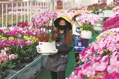近日,在湖州市吴兴区八里店镇的兰鑫花卉基地,员工们在整理准备上市的蝴蝶兰。