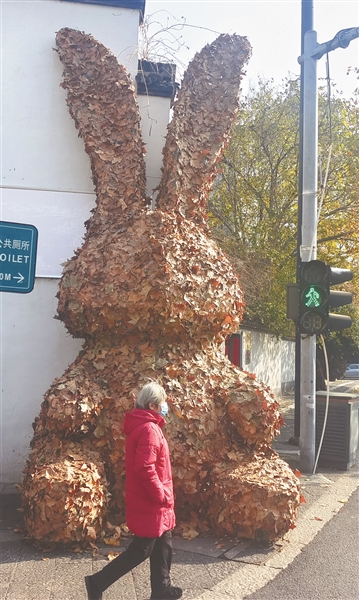 日前,在杭州市中山中路254号旁,出现一只高达4米的巨型落叶兔,引得市民纷纷前来拍照、观望。据了解,这是中国美院秋叶艺术节的作品,它是内部先用铁丝等把框架搭好后,再把落叶粘贴上去的,该作品名叫《“星”愿使者》,祝愿每个人在兔年有个新的开始。