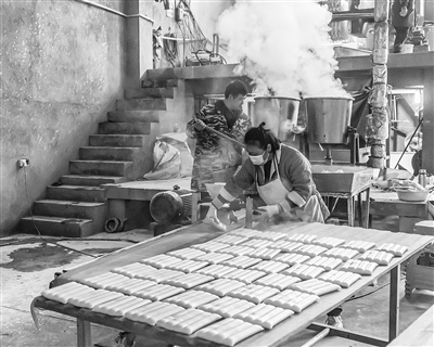 春节临近,春节食品生产进入旺季。日前,在种粮大户衢州柯城区坦上家庭农场基地里,一派热气腾腾,人们忙着加工年糕,供应春节市场。该农场有效延长稻米产业链,以销定产加工年糕,每日耗用大米5000斤,至今已转化大米60多万斤,有望超过往年。这一举措,既抓住了春节商机,又有效缓解卖粮难,可谓“一石二鸟”。通讯员胡江丰 摄