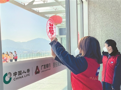 近日,在金华车务段缙云西站,志愿者们正在候车厅贴福字、挂灯笼,为旅客的返乡路增添“年味儿”,而玻璃门外的站台上,另一批志愿者正为乘客提供引导服务。