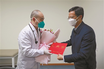 | 吕志良看望慰问一线防疫医护人员,并送上慰问金。 记者李国峰 摄 |