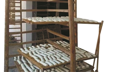 年糕做好取回家,先得在晒箕上摊晾,放得几天,使其由软变硬——但也不能真的晒成了干。