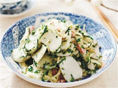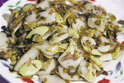 冬天时,冬笋初上,用冬笋丝、雪里蕻、肉末炒年糕,最是“高级”。春天笋出时,若用野山笋炒,亦是美味。只是现在的雪里蕻都受“绿色”误导,成品是绿绿的,十分难看,且酸劲不足。我们以往的做法,却是要将收割后雪里蕻先埋成堆,以作发酵,腌制后其叶茎成金黄色,酸劲十足。炒成后,白玉片是糕,金黄丝是笋,脆黄带黑绿色的是雪里蕻,粒粒玛瑙般附于其间的是肉末,其味酸中带鲜,天下无敌。