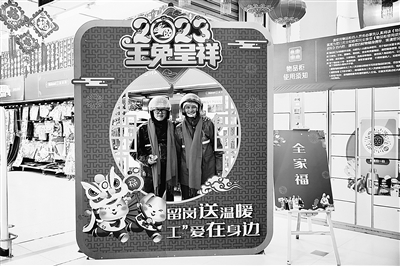 | 图为新就业形态劳动者领取礼包后开心留影。 |