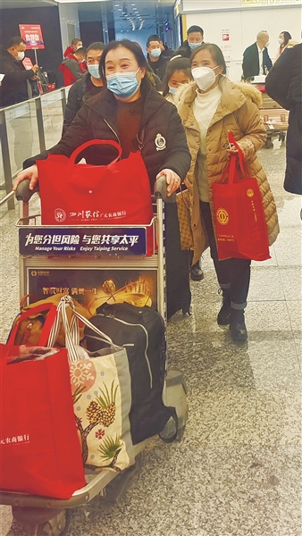 据了解,利州区人社局、利州区总工会等单位的工作人员还给每一位出行的农民工朋友准备了包含保温杯、雨伞、背包、洗漱用品、食品、矿泉水、口罩、纸巾等用品的返岗礼包。图为四川广元农民工抵达杭州机场场景。