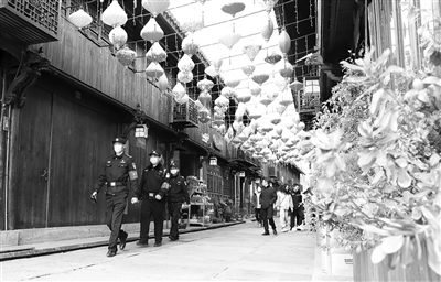春节假期,台州市路桥公安分局组织警力加强对景点、公园等的巡逻密度,竭诚为群众服务。图为1月26日,路桥区路桥派出所民警在十里长街巡逻。通讯员蒋友青、王贝倪 摄