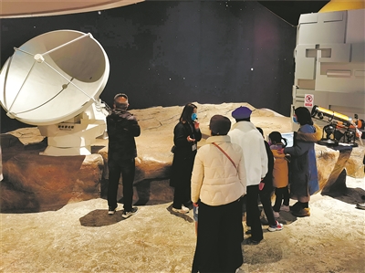记者李国峰报道 “老师,您知道月亮上的嫦娥和玉兔住在哪里吗?”“嫦娥,老师不知道,但玉兔我知道,咱们国家首辆月球车‘玉兔号’就在这里,听老师给大家解密我们的新科技!”大年初三一早,省科技馆新年开馆的第一天,“玉兔号月面展区”新年科普小课堂前吸引了不少“兔宝宝”前来打卡。顺着孩子们的目光望去,一席深蓝色制服、外戴“小蜜蜂”的讲解员蓝露丹格外引人注目,此刻的她正在坚守展厅,用一个个有意思的小故事将一颗颗爱科学的种子播种在孩子们心中。
