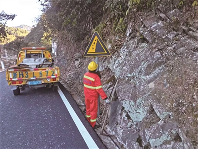 连日来,开化县公路港航与运输管理中心加大山区公路的安全隐患排查力度,维护安全畅通春运环境,助力全国文明城市创建。图为1月31日,该中心养护人员正在县道三姜线安装相关安全标志牌。