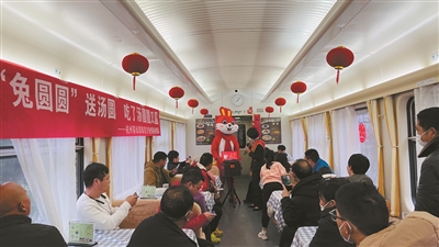 | 春节的鞭炮声犹在耳畔,团圆的浓浓温情温馨暖人。昨日,杭州客运段甬广车队K209次列车上到处洋溢着节日的喜庆。旅客和列车工作人员欢聚在车厢内,一起猜灯谜、吃汤圆、做灯笼,互送节日祝福,带着新年的美好愿望向前进。通讯员陈杨、蒋楼刚 摄 |