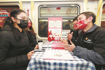 招聘会开始前,党的二十大代表、中国铁路上海局集团有限公司杭州客运段高铁一车队列车长车菲菲宣讲了党的二十大精神。在宣讲中,“使人人都有通过勤奋劳动实现自身发展的机会”这样的表述一下子引起了大家的共鸣,掀起了现场招聘的高潮,不大的招聘车厢很快挤满了新时代的奋斗者们。
