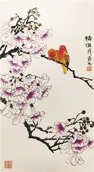 泡桐花,入花鸟画,世人画得很少。因为泡桐花开于早春,树高大,给写生带来不便。树叶没有长出来,花就开放了,品性耐寒。徐家昌先生首创性把淡紫色的泡桐花与黄色红脸鹦鹉画在一起,画面清新别致,鹦鹉依偎呢喃嘤矣,桐花和风微动,赞美原野春早。画右上题唐人句:雕笼终不恋,会向故山归。体现了珍爱自然,天人合一的境界。