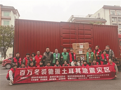 由温州市天爱公益协会、瑞安市伯特利慈善基金、温州都市报陈忠慈善工作室,联合温州市外贸服装商会、珍瑾服装、迪亚服饰、丑鸭服饰、麦娇奴服饰、燕王内衣、仕本服饰、迷迦勒服装、童象儿童内衣等单位捐赠的羽绒服、棉衣、保暖内衣、棉鞋之类御寒衣物,装满了一辆10吨货车。近日,从温州出发,运到土耳其驻上海领事馆接收的爱心物资仓库,将统一运往土耳其,给地震灾区送上温暖。