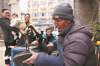 湖州市德清县乾元镇古城77岁鞋匠孔木林,在街头摆摊“小修小补”鞋子达40年,深受居民欢迎。