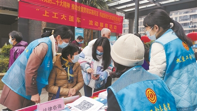 2022年12月8日,杭州市上城区九堡街道总工会新市民志愿服务中心开展了一场别具声色的“上工大篷车”流动服务活动,专门为快递员、外卖员等新就业形态劳动者提供公益法律咨询并进行《工会法》宣传等,将关心关爱精准送到新就业形态劳动者的身边,有效增进他们的归属感、幸福感。