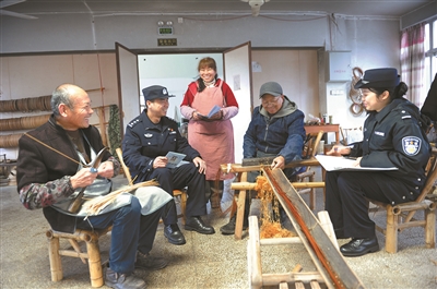 近日,东阳市公安局虎鹿派出所民警到辖区一家竹制品企业走访,了解企业复工复产情况,深入车间开展安全生产检查,并对员工进行反诈知识宣传,进一步提高大家的安全生产和网络安全防范意识。图为民警在车间了解生产情况。通讯员蔡伟华 摄