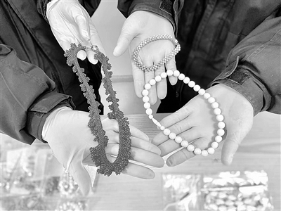 经现场开拆,发现该邮件内部分饰品呈现乳白色且具有十字交叉纹路,属于象牙制品特有的“利兹纹”。此外,邮件内其余一批饰品上带有纹路细密的生长纹,还能见到细小的虫蛀孔,属于红珊瑚制品的特点。经专业机构鉴定,邮件内的8件饰品为现代象象牙制品,毛重121.21克(含金属部分);46件饰品为红珊瑚制品,毛重262.53克(含金属部分)。