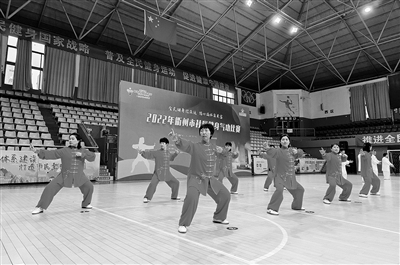 昨天,一场以“全民健身迎亚运,信心满怀奔共富”为主题的衢州市社区运动会健身气功比赛在龙游县体育馆进行。来自衢州市8个社区代表队96名运动员参加了5个健身气功集体项目、6个健身气功个人项目的比赛。图为社区运动员正在八段锦比赛项目中。 通讯员陶弘 摄
