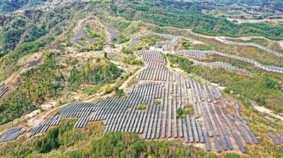 昨日,鸟瞰仙居县上张乡一处光伏发电站,山坡上一排排蓝色的光伏板在阳光照射下源源不断地输送着绿色能源。近年来,仙居县上张乡通过流转荒山引进发展光伏产业,既为村集体带来了山地租金收入,又为村民提供了劳务就业,帮助山区农民增收。
