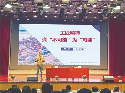 在热烈的掌声中,竺士杰以主旨演讲的方式向在场的青年学子们讲述自己在平凡岗位上创造的不凡业绩。竺士杰扎根码头生产一线,从一名技校毕业生、一名桥吊操作司机,成长为一名全国劳模、大国工匠。从业20余年,自创并持续改良“竺士杰桥吊操作法”,提升了传统桥吊操作效率。他在分享时说,“政府工作报告强调要‘加快建设现代化产业体系’,这背后离不开广大的技能人才,我想只要我们沉下心来学好技能,以劳模精神、劳动精神、工匠精神引领自己的职业道路,做好每天的工作,一定能够成为‘匠人’,为社会作出更大贡献。”