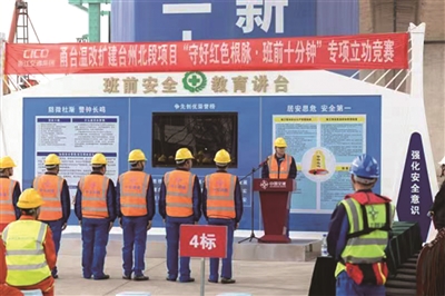 3月22日下午,浙江交通集团甬台温改扩建台州北段项目指挥部在灵江特大桥6号墩现场举行“守好红色根脉·班前十分钟活动”专项立功竞赛活动。