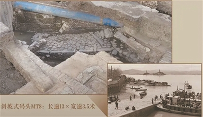 此次发现的码头遗址,除一座为北宋斜坡式码头外,其余多呈台阶式。斜坡式码头依托海坛山山脚基岩,由块石砌筑而成,呈平缓斜坡状。台阶式码头面向瓯江而筑,由东向西排列,与江堤的延伸一致。平面形状呈长方形,石包土心结构。码头内部填土,上垫木板,板上铺方砖,砌筑考究。构筑方式采用大小不一的条石和块石叠砌,石缝用石片衬平,外层用长木群桩严实加固,以防水流冲击。同时使用木板、砾片和萁芒,增强吸水性,膨胀后对桩周边淤泥有挤密作用。这种巧妙运用“群桩”“排桩”“柱梁”结构体系,承受来自不同方向的力量,加上木石结合、硬软兼施,门类繁多的软土地基处理的做法,在国内实属罕见。
