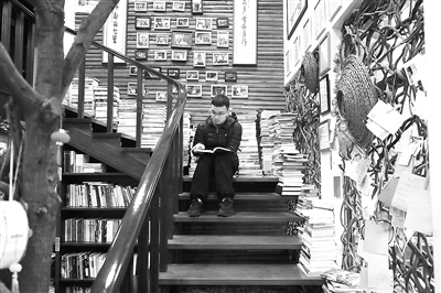 | 拾级而上的每个台阶,都摞着厚厚一堆书,没有沙发坐的时候,这儿可是最佳席位。 |