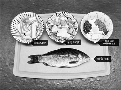 准备工作:羊排和羊肉放清水中泡半小时,去除膻味。鱼杀好洗净。葱切成葱花,生姜带皮切片,枸杞洗净备用。