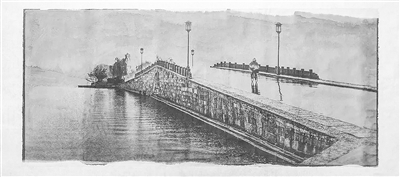 据了解,《宋韵西湖·断桥》采用的是有“纸寿千年”之称的安徽省泾县宣纸,通过“蓝晒法”晒印。蓝晒印相法,又称铁氰酸盐印相法、氰版印相法,以铁为感光元素,是在1842年由英国人约翰·赫谢尔发明。“蓝晒法”的操作流程不像湿版火棉胶那么繁复,最大的难点在于对曝光的控制。