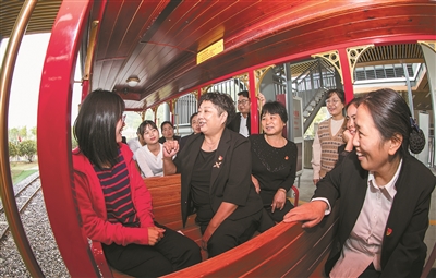 | 裘丽琴(左二)带游客乘坐鲁家村观光小火车。 |