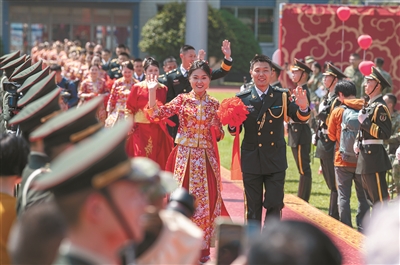 当天,金华市双拥办、驻金某部联合举行第二届“爱在婺江畔,情定先锋旅”集体婚礼活动。38对新人在亲人和战友的见证下真情告白、互赠信物、共饮美酒、为祖国祝福,情定军营,喜结良缘。