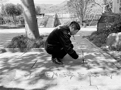 王志明透露,刚开始的时候,他不好意思在景区的石板上写。“我以前修电机拿的是榔头,现在我是放下了榔头,拿起了毛笔。”王志明说,书法没有捷径,只能练,练得自己看得过去了,他才到石板上写,“纸上只能写小字,我喜欢写大字,石板上没有局限,方便又节约成本。”