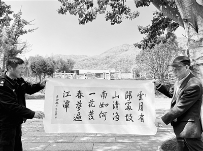 出了王右军祠,一路沿着兰亭江,就到了景区出口。“呀,老丁,你怎么把我的‘纸’弄脏了!”老丁是景区出口的门卫,王志明把毛笔和装清水的碗放在门卫室,巡逻完就到门卫室外边写字。笔者看到,门卫室里还挂着王志明送给老丁的两幅字。