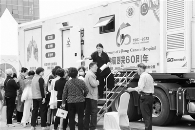 | ▲义诊活动的移动筛查车,可以做低剂量肺部CT、B超检查等。当天提供的筛查项目包括肺癌、乳腺癌、甲状腺癌等。 |