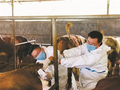 | 刘晓峰(左)在牛尾静脉采血。 |