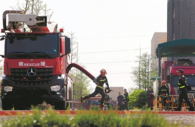 图为吸水管连接消火栓操竞技。通讯员傅元璋 摄