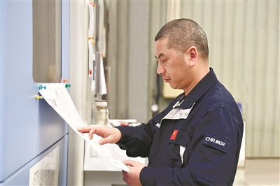 | 林绿胜在车间检验复杂零件加工图纸。 |