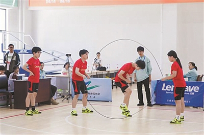 本报讯 记者羊荣江报道 一根根绳子上下翻飞,一个个身影健步如飞。近日,由浙江省教育厅、浙江省体育局主办的浙江省第四届中小学生跳绳锦标赛,在金华五中成美校区体育馆举行。来自全省各地35支队伍近500名选手各显“绳”通,展开激烈角逐。
