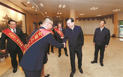 | 昨日下午,刘忻、吕志良看望晋京表彰的劳模先进代表。 记者邹伟锋 摄 |