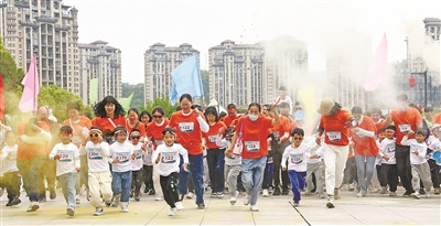 4月26日,小朋友和家长在仙居县永安溪绿道上参加“彩虹跑”活动。当日,仙居县迎晖幼儿园举行“童心迎亚运 亲子彩虹跑”活动,小朋友和家长共400余人参与激情奔跑,喜迎杭州亚运会。