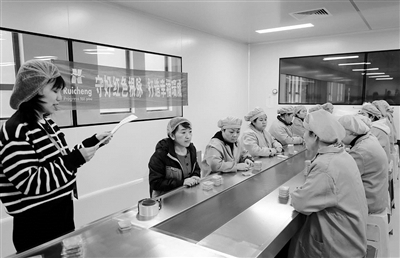 | 近日,瑞成公司包装车间班前会上领讲员周鸯鸯(左一)为大家宣讲。记者邹伟锋 摄 |